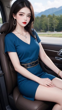 1girl,jewelry,solo,long hair,necklace,belt,motor vehicle,sitting,dress,looking at viewer,ground vehicle,red lips,black hair,blue dress,car,lipstick,outdoors,short sleeves,brown eyes,parted lips,makeup,mountain,earrings,lips,brown hair,blurry,