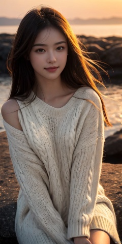 best quality, masterpiece, realistic,cowboy_shot,(Good structure), DSLR Quality,Depth of field,kind smile,looking_at_viewer,Dynamic pose, ultra-high definition,extreme detail,8k,realistic,(masterpiece:1.3),(best quality:1.3),(photorealistic:1.4),realistic,4k,detail face (dark scene, soft lighting, high saturated):1.4, vivid illumination, enchanting elegance, atmospheric depth, masterful technique, naturalistic representations, harmonious composition, creative refinement, striking juxtapositions, (1girl, young beauty), sitting, , looking at viewer, from above, sharp focus, oversized_sweater, shoulder, ((sunset)),volumetric fog, outdoors, backlight, , ,