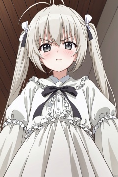 1girl solo long hair looking at viewer  , dress bow ribbon twintails upper body white hair frills indoors white dress grey eyes from below antenna hair anime coloring kasugano sora,Angry, blushing