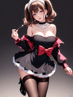 realistic style, cinematic work, 8k wallpaper, masterpiece, very realistic quality, best quality, masterpiece, high-level, high-resolution,,,edge lighting, dual tone lighting, soft lighting, the illuminated surface of the material has bright spots and highlights, which flicker and have a mirror effect when reflected, there are sparkling spots on the armor,,,1 girl, mature female, solo, full body, looking at viewer, lace, strong rim light, standard proportion of female body, golden proportion of female body,,,standing, standing posture, sexy full body standing posture,,,,(z35 3, 1girl, brown hair, purple eyes, blue eyes, blush, bangs, medium hair,breasts, pantyhose, bare shoulders, dress, high heels, shoes, maid headdress, jacket, long sleeves, black footwear, medium breasts, cup, maid, black jacket, bow, two side up, brown pantyhose, apron, drinking straw, detached sleeves, off shoulder, black dress, frills, bowtie, shoes removed, maid apron, strapless, disposable cup, frilled dress, open jacket, twintails, open clothes, choker, strapless dress, head tilt, coat, single shoe, waist apron, shoe dangle,:1.2),,bare shoulders, off shoulder, black hairband, bikini bottom only, short dress, swimsuit, pleated dress, bikini, floating hair, blush, ass visible through thighs, skirt,white high-heeled shoes,:1.2),,,colorful,(detailed skin: 1.3), (detailed face: 1.3),clear focus,delicate,(mature women: 1.2),(glossy skin+glossy skin: 1.4),(sweating: 1.1),(big_eyes),red_ eyeshadow,long_ eyelashes, red lips,,,simple background, grey background,,,(diamond hair accessories, diamond necklaces, diamond earrings, diamond earrings, clothes embedded with diamonds, armor embedded with diamonds,:1.3),, hufeng, duosaitejun, devil, hanfu, z35,z35_2<lora:EMS-328196-EMS:0.260000>
