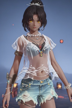 1girl, jewelry, solo, dark skin, dark-skinned female, shorts, necklace, earrings, denim, denim shorts, navel, see-through, looking at viewer, cutoffs, black hair, short hair, cowboy shot, short shorts, thigh strap, yellow eyes, bra, breasts, underwear, facial mark