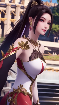 lingmeier, 1girl, dress, solo, jewelry, red dress, looking at viewer, earrings, necklace, hair ornament, black hair, from side, smile, bare shoulders, realistic,masterpiece,best quality,moyou