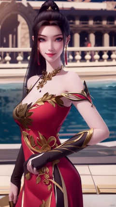 lingmeier, 1girl, dress, solo, jewelry, red dress, looking at viewer, earrings, necklace, hair ornament, black hair, whole body, standing, smile, bare shoulders, realistic,masterpiece,best quality,moyou