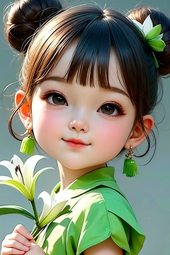 <lora:cka01:0.8>,cka01, 1girl, solo, earrings, jewelry, hair bun, flower, double bun, holding, holding flower, looking at viewer, white flower, bangs, black eyes, hair ornament, short sleeves, simple background, closed mouth, chinese clothes, smile, brown hair, child, upper body, female child, black hair, flower earrings, hair flower, short hair, realistic, dress, green shirt, tassel, grey background, lily \(flower\), green dress, eyelashes, blunt bangs, best quality, ultra-detailed, masterpiece, finely detail, highres, 8k wallpaper