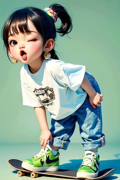 <lora:cka01:0.8>,cka01,1girl,solo,shirt,one eye closed,jewelry,earrings,shorts,ponytail,black hair,long hair,shoes,skateboard,black eyes,full body,scrunchie,socks,denim,short sleeves,child,bangs,simple background,t-shirt,green shirt,female child,standing,leaning forward,blue shorts,denim shorts,print shirt,sneakers,white socks,open mouth,, best quality, ultra-detailed, masterpiece, finely detail, highres, 8k wallpaper