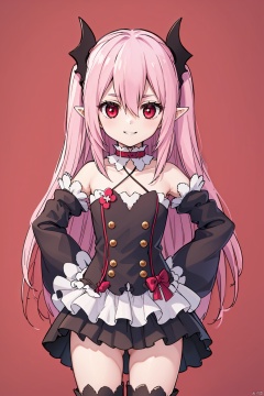 1girl ,solo, long hair ,looking at viewer, smile ,proud,proud,Royal background, red eyes, thighhighs ,dress bare ,shoulders ,pink hair, detached sleeves ,pointy ears ,flat chest ,two side,  hands on hips ,vampire,krul tepes,1girl,krul tepes,Vampire's Teeth,slim,Thin legs,krul tepes,Slender legs, slim,krul tepes,Hang a leg,