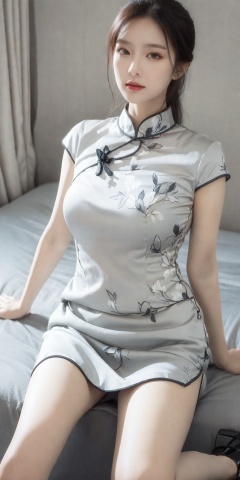 masterpiece,best quality,absurdres,highres,game cg,8k,HDR,ray tracing,perfect face,perfect eyes,intricate details,highly detailed,film grain,photorealistic,depth of field,realistic,1girl,solo,perfect face,look at viewer,sitting,large breasts,short sleeves,white dress,chinese clothes,china dress,side slit,black footwear,high heels,masterpiece,best quality,highly detailed,