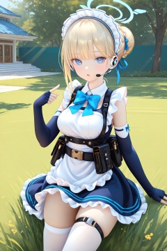 looking_at_viewer,short sleeves, thighhighs, gloves,dress, bow, thighs, frills, black gloves, elbow gloves, fingerless gloves, bowtie,apron,maid, maid headdress, thigh strap, blue bow, maid apron, headset, pouch, blue bowtie, holster, harness, thigh holster, chestharness,earpiece, blond_hair,