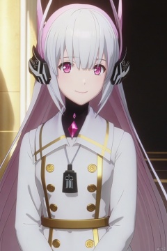 masterpiece,bestquality,4k,3d,animescreencap,{{masterpiece}},illustration,best quality,extremely detailed cg unity 8k wallpaper,original,high resolution,{{{{{extremely delicate and beautiful girl}}}}},1girl,solo,white hair,headgear,very long hair,beautiful detail eyes,jewel eyes,{{pink eyes}},good lighting,{{{{ray tracing}}}},sparkling,depth of field,looking at viewer,pov,cowboy shot,white coat,smile