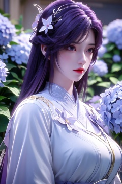 masterpiece, best quality,1girl, hair ornament, solo, long hair, purple hair, realistic, flower, upper body, , closed mouth, lips,Xyunxi,, (big breasts:1.29),depth of field,X-Hydrangea,xhuolinger,Xsulingyun, Yunxiao_Fairy
