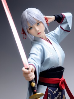 (masterpiece, best quality:1.2),kamisato_ayaka,1girl,aqua_eyes,arm_armor,armor,arms_up,collared_dress,covered_mouth,cowboy_shot,dress,eye_trail,floating_hair,grey_dress,grey_hair,hair_ribbon,high_collar,holding,holding_sword,holding_weapon,japanese_armor,japanese_clothes,katana,kusazuri,light_trail,long_hair,looking_back,pink_ribbon,red_rope,ribbon,rope,sideways_glance,sleeves_past_elbows,solo,standing,sword,tassel,tress_ribbon,underbust,unsheathed,weapon,