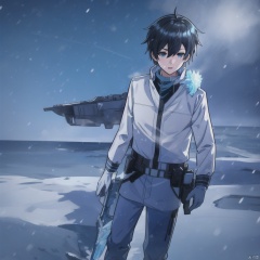 1boy,solo,snow,stronghold,Combat Uniform,Ice debris on the sea, huge icebreakers