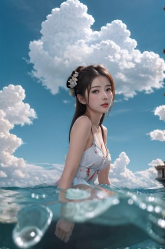 1girl,blue sky and white clouds,water,leg,