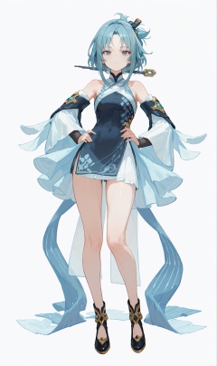 score_9, score_8_up, score_7_up, score_6_up, 8k, 8k, best quality, masterpiece, (ultra-detailed:1.1), (high detailed skin), (full body), ( simple background,white background:1.3), standing, looking at viewer, (solo), hand on hip, <lora:ping-gui-pony-Tanger:0.8>, aping, aping's def clothes, detached sleeves, aping's dress, chinese clothes, blue hair, parted bangs, (beautiful_face), ((intricate_detail)), clear face, ((finely_detailed)), fine_fabric_emphasis, ((glossy)), full_shot,