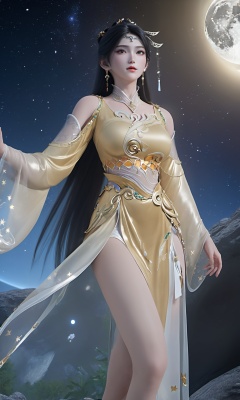 Gillian,front view of Gillian-type woman with black long straight hair wearing golden JPE-type Hanfu,quality,shiny skin,masterpiece,NSFW,highly detailed,<lora:Gillian-000017:0.9>,soft light,full moon,