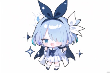 1girl, solo, short hair, open mouth, bangs, blue eyes, skirt, shirt, long sleeves, white background, bow, ribbon, holding, school uniform, standing, full body, ((blue hair)), two-tone hair, multicolored hair, pleated skirt, hairband, shoes, serafuku, puffy sleeves, sailor collar, chibi, hair over one eye,sparkle, white footwear, white skirt, blue shirt, white bow, gem, white ribbon, puffy long sleeves, white sailor collar, white hairband, colored inner hair, bow hairband, arona \(blue archive\),