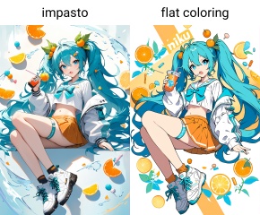 masterpiece,impasto,1girl, long hair, very long hair, skirt, solo, food, holding, navel, hatsune miku, twintails, blue hair, fruit, jacket, hair ornament, blue eyes, socks, pleated skirt, shoes, thigh strap, midriff, food-themed hair ornament, phone, drinking straw, full body, open mouth, cup, orange slice, yellow skirt, shirt, orange \(fruit\), open clothes, looking at viewer, open jacket, white shirt, candy, miniskirt, hair between eyes, long sleeves, lollipop, cellphone, holding phone, holding cup, sailor collar, white footwear, crop top, orange skirt, flower, white jacket, stomach, bow, sneakers