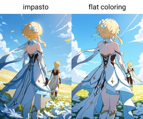 masterpiece,impasto,1girl, lumine \(genshin impact\), 1boy, blonde hair, aether \(genshin impact\), dress, brother and sister, white dress, flower, siblings, sky, hair ornament, white flower, cloud, braid, hair flower, yellow eyes, short hair with long locks, gloves, pants, ahoge, blue sky, boots, standing, detached sleeves, outdoors, petals, white footwear, white scarf, scarf, bare shoulders, long hair, back, short sleeves, brown shirt, backless outfit, single braid, flower field, day, backless dress, twins, shirt, short hair, field, hair between eyes, sidelocks