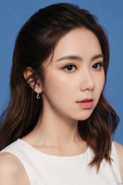 1girl, solo, looking at viewer,  brown hair, brown eyes, jewelry, closed mouth, upper body, earrings, lips, blue background, portrait, realistic, nose