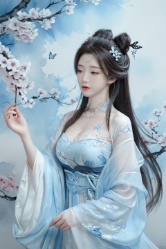 masterpiece,(best quality),upper_body,,exploring cherry blossom branches,wonderland,light blue element, sly,Xsulingyun,(big breasts:1.79),Xtianxiwei,fantasy_butterfly, New Chinese_Hanfu,Xnangongwan, X-Hydrangea, traditional chinese ink painting,black and white ink painting