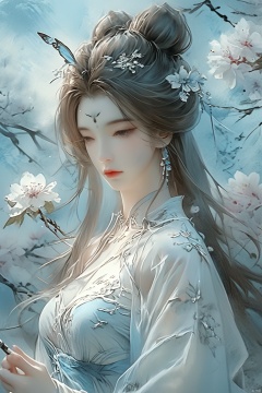 masterpiece,(best quality),upper_body,,exploring cherry blossom branches,wonderland,light blue element, sly,Xsulingyun,(big breasts:1.79),Xtianxiwei,fantasy_butterfly, New Chinese_Hanfu,Xnangongwan, X-Hydrangea, traditional chinese ink painting,black and white ink painting