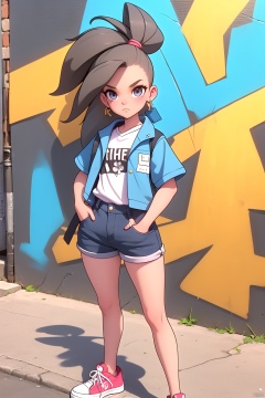 best quality,masterpiece,illustration,earrings,,hand in pocket,Denim shorts,an extremely delicate and beautiful,extremely detailed,CG,unity,8k,wallpaper,Amazing,finely detail,1 girl, solo, street, graffiti, white short sleeved, denim jacket, denim shorts, sneakers, spray painting,graffiti on the wall, hip-hop, street culture, jtc
