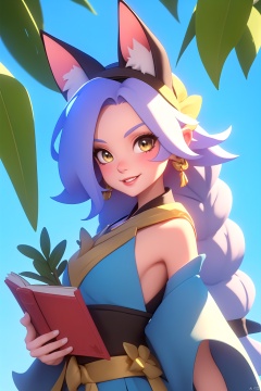 1girl, solo, long hair, looking at viewer, blush, smile, bangs, hair ornament, bow, animal ears, jewelry, yellow eyes, upper body, pink hair, braid, flower, hair bow, hairband, earrings, outdoors, parted lips, alternate costume, cat ears, from side, looking to the side, book, single braid, blue bow, plant, white flower, hair over shoulder, floppy ears, goldenglow \(arknights\), jiqing, 1 girl,moyou