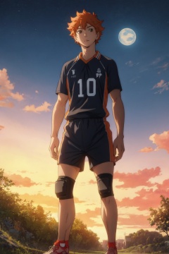 <lora:Hinata-000013:0.8>,Hinata CYQL,1boy,male focus,looking at viewer,solo,full body,orange hair,short hair,brown eyes,sportswear,volleyball uniform,shorts,black shorts,knee pads,socks,shoes,standing,smile,cowboy_shot,Landscape, Lunar, Moon, Craters, Rocks, Silence, Serenity, Mystery,(Enchanted trees, Fireflies, Glowworms, Magic atmosphere, Twilight hues, Whispers of the forest:0.5),beautiful detailed sky,beautiful detailed glow,masterpiece,best quality,wallpaper,