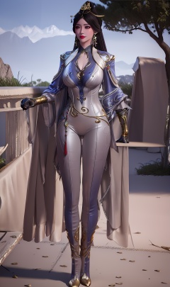 3D,masterpiece,(best quality),(makeup),official art, extremely detailed cg 8k wallpaper,((crystalstexture skin)), (extremely delicate and beautiful),(highly detailed),(1girl), (solo), (jewelry), (earrings),(black_hair),(long_hair),(hair_ornament),(handwear),(breasts),(standing),(collar),(tassel),(tiara),(crown),,((full_body,whole_body)),(multicolored_clothes),(multicolored_dress),(gloves),(cleavage),(bodysuit),(chinese_clothes),(adapted_costume),(long_legs),(gold_trim),(pants),(pantyhose),(sunshine, outdoor),((looking_at_viewer)),((Facing the camera)), (high_heels),(boots),, <lora:hipoly3DModelLora_v10:0.3>