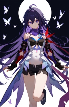<lora:星铁希儿2pony:1>,seele (honkai: star rail),a girl named seele (honkai: star rail),1girl,solo,looking at viewer,bare shoulders,purple scarf,black shorts,covered navel,short shorts,black gloves,detached sleeves,fingerless gloves,black footwear,scarf,butterfly,, (score_9,score_8_up,score_7_up),(masterpiece,best quality,high quality:1.2),absurdres, prefect lighting, very aesthetic, anime BREAK