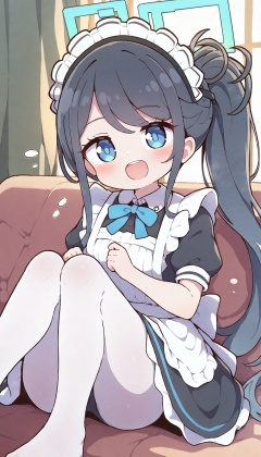 1girl, aris (maid) (blue archive), solo, aris (blue archive), black hair, halo, blue eyes, long hair, apron, maid headdress, maid, smile, official alternate costume, looking at viewer, short sleeves, open mouth, maid apron, white apron, dress, pantyhose, very long hair, black dress, blush, white pantyhose, sitting, frills, frilled apron, puffy short sleeves, ponytail, ribbon, puffy sleeves, upper teeth only, knees up, flower, :d, masterpiece,newest,absurdres,safe,