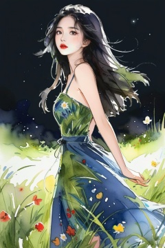 A girl with long black hair, looking from the bottom up, wearing a grass-woven dress, the skirt is full of grass, standing on the grass, the grass is full of flowers. dark night.