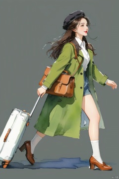 A girl, single, smiling, long hair, simple background, brown hair, shirt, green coat, black long leather shoes, black stockings, whole body, white shirt, leather bag, side view, beret, striding, big suitcase , hand pulling suitcase.
