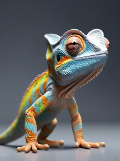 Cute chameleon, realistic, grey background, teeth, depth of field, solo, full body, shadow
