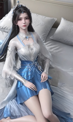 Limuwan,front view of a girl with long black hair wearing white tulle and  blue long skirt,lying on bed,bare legs,side face,highly detailed,ultra-high resolutions,32K UHD,best quality,masterpiece,reflective,<lora:Limuwan>,in the bedroom,