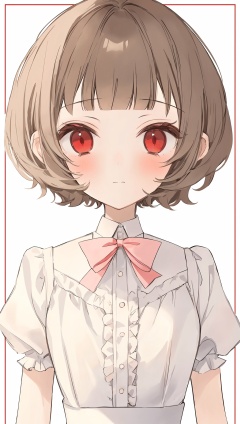 1girl,solo,bow,brown hair,red eyes,blush,short hair,white bow,bangs,upper body,looking at viewer,closed mouth,bowtie,white bowtie,grey background,hair bow,simple background,blunt bangs,frills,shirt,puffy sleeves,white shirt,ribbon,dress,white border,red bow,