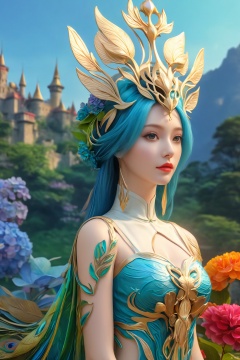 Best Quality, masterpiece, ultra-high resolution, (photo realistic: 1.4) , Surrealism, Fantastical verisimilitude, beautiful blue-skinned goddess Phoenix Peacock on her head, fantastical creation, thriller color scheme, surrealism, abstract, psychedelic, 1 girl,flower,castle,jyy-hd,1 girl,(big breasts:1.39),,Xliushen,Xyunxi,Xhuolinger,X-Hydrangea,Hydrangea, ty-hd
