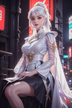 1girl,solo,(sitting:1.5),(hand drooping:1.2),anklet,black skirt hem,cape,chain,dress,hair ornament,jewelry,long hair,long sleeves,looking at viewer,makeup,ponytail,red lips,see-through,white and black dress,white dress,white hair,wide sleeves,brown eyes,(neon lights:1.1),night scenes,(cyberpunk:1.2),outdoors,street,building,depth of field,(ultra-detailed, highres, extremely detailed,Exquisiste Craftsmanship,High-Resolution Beauty,Unparalleled Artistic Quality),(Stunning Composition),(Photorealism),(Breathtaking Textures),(Superb Clarity),(Impressive Depth),red lips,(Masterful Brushwork),(Breathtaking,Artistic Precision,Unparalleled Artistic Quality,Immersive Quality),(Immersive Quality),masterpiece,illustration,extremely delicate and beautiful_CG,unity,(8k wallpaper),(colorful),(Photorealistic Precision),(Rich Dynamic Range),(Amazing,Incredible Clarity),(official art),(HRD, HUD, 8K),(glossy skin),(colourful),(Rich Textures,Impeccable Detail),(Exquisite Visuals),(Vivid Colors),(Masterful Color Rendering),(Intricate Details),(perfect soft tender delicate white skin:1.2),(bright pupils:1.2),<lora:场景人物颜色过滤1.0_v4-000016:0.5>,<lora:细节制造_V1:0.4>,<lora:NM_手部改变器_1.0:0.3>,<lora:洛雪-妖神记明月无双:0.6>,