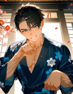 1boy, male focus, japanese clothes, yukata, muscular male, muscular, paw pose, solo, looking at viewer, grin, black hair, blue eyes, short hair, flower, petals, best quality, amazing quality, best aesthetic, absurdres