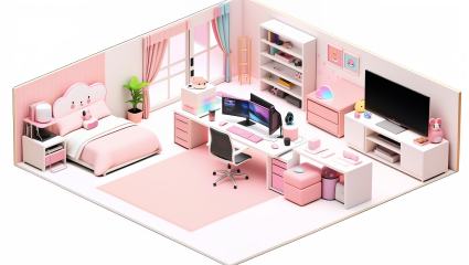 masterpiece,best quality,<lora:gamebg:0.5>,3d,white background,no humans,room-style,soft pink carpet,light blue walls,cute wallpaper patterns,large floor-to-ceiling windows,light white lace curtains,cute plants,large gaming desk,comfortable pink gaming chair,high-end streaming equipment,high-definition camera,professional microphone,triple monitor setup,RGB keyboard,RGB mouse,cute ornaments,stationery,RGB LED strip lights,display cabinet,figurines,plush toys,bookshelf,gaming guidebooks,decorations,cozy small sofa,decorative paintings,VTuber posters,mini snack bar,snacks,drinks,