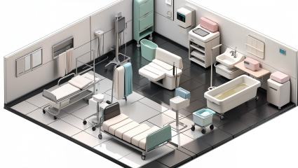 masterpiece,best quality,<lora:gamebg:0.6>,3d,white background,room-style,antimicrobial seamless PVC flooring,light green or light blue,easy to clean,smooth white walls,antimicrobial coating,shadowless surgical lights,bright and even lighting,stainless steel operating table,adjustable height and angle,medical equipment,anesthesia machine,patient monitor,infusion pump,suction machine,wheeled instrument table,surgical tools,scalpels,scissors,forceps,suturing needles,sterile handwashing area,washbasin,sensor faucet,automatic soap dispenser,changing area,lockers,dressing bench,sterile surgical gowns,surgical caps,medical waste disposal area,waste bins,central oxygen supply system,touch screen monitors,vital signs,surgical progress,constant temperature and humidity,high-efficiency air filtration system,automatic sliding doors,sterile environment.,