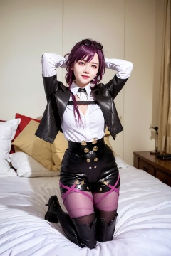 masterpiece, best quality,realistic, (photoshop \(medium\):1.4),<lora:kafka:1>,kafka (honkai: star rail),1girl,solo,eyewear on head,purple hair,long hair, purple eyes,purple gloves,black jacket,white shirt, collared shirt,long sleeves,black shorts,purple pantyhose, thigh boots, black footwear,smile, looking at viewer, seiza, arms behind head, eyewear on head, bed,full body,eyewear on head,