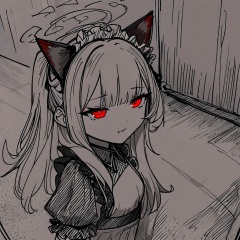 masterpiece, best quality,<lora:style52-a31-000018:1>, monochrome, sketch,white hair,long hair,1girl,solo,cat ears, maid,red eyes,bangs,