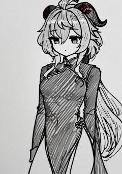 masterpiece, best quality,<lora:style52-a31-000018:1>, greyscale,sketch,1girl,solo,ganyu \(genshin impact\), cowboy shot, messy hair, chinese clothes, expressionless, mature female, simple background, white background, long hair,expressionless, ponytail,