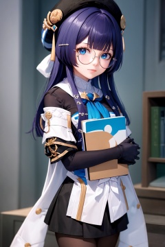 masterpiece, best quality, <lora:pela:1>,english text, pela (honkai: star rail), 1girl, pantyhose, solo, book, hat, blue eyes, glasses, holding, gloves, looking at viewer, blush, holding book, blue hair, bangs, long hair, skirt, purple hair, beret, hair ornament