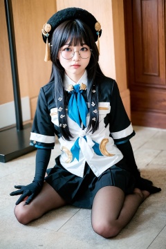 masterpiece, best quality, <lora:pela:1>,realistic, (photoshop \(medium\):1.4),glasses, pela (honkai: star rail), 1girl, solo, pantyhose, long hair, hat, looking at viewer, skirt, sitting, blue eyes, bangs, no shoes, black skirt, blue hair, wariza, gloves, hair ornament, black headwear, beret, shirt, black pantyhose, closed mouth, breasts, necktie, long sleeves, feet, full body