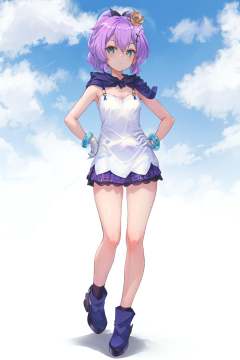 <lora:javelin_v1.0:0.8>,javelin\(azur lane\),1girl, solo, bracelet,white gloves, purple_hair, mini_crown,white_camisole, hair_ornament, looking_at_viewer, black_ribbon, hair_ribbon,blue hood,outdoors, full body, hands on hips, masterpiece, best quality,