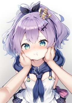 <lora:javelin_XL_v1.0:0.8> ,javelin_\(azur_lane\), ponytail,purple hair,hair_ornament, ribbon, mini_crown,hair_ribbon,hood, white_camisole,pout,face_squeeze,squeezing_cheeks,upper body,arms at sides,hands_on_another's_cheeks,by ikeuchi tanuma,(pov hands),from above,looking at viewer,, masterpiece, best quality, very aesthetic, absurdres,
