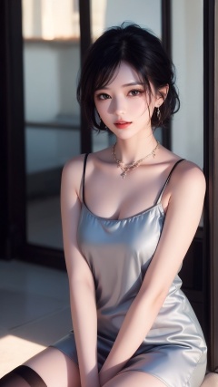 1girl,jewelry,earrings,solo,dress,black hair,black dress,looking at viewer,necklace,night,black eyes,short hair,collarbone,sleeveless dress,realistic,spaghetti strap,