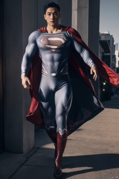 jzns,hly,wak,1man,asian,male focus,handsome,delicate face,muscular,(superman white bodysuit,military white knee boots,red cape),outdoors,street,golden hour lighting,walking,full body,masterpiece,realistic,best quality,highly detailed